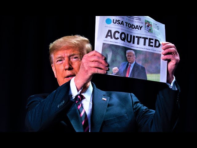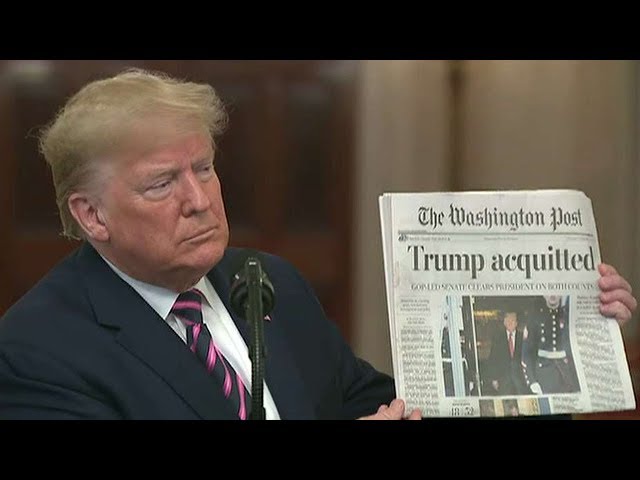 El mandatario enseñó triunfalmente a los asistentes la portada del diario Washington Post, con el titular “Trump absuelto”, y aseguró que tiene “suerte” de tener a gente que le “defiende”, es decir, los republicanos en el Senado, porque si no, “esto habría sido un incidente horrible para el país”.