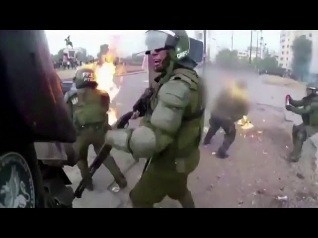 Chilean police officers set on fire by Molotov cocktails - Impact Video