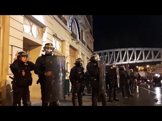 Young people wearing masks shouted "revolution" as tear gas drifted by the Bastille, the square where the French revolution erupted in 1789.