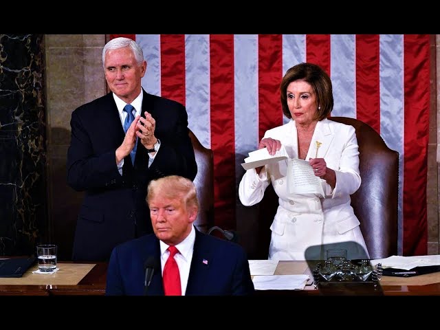 Trump-Pelosi feud erupts during speech to Congress as impeachment trial nears end. Pelosi appears to rip up Trump's speech.